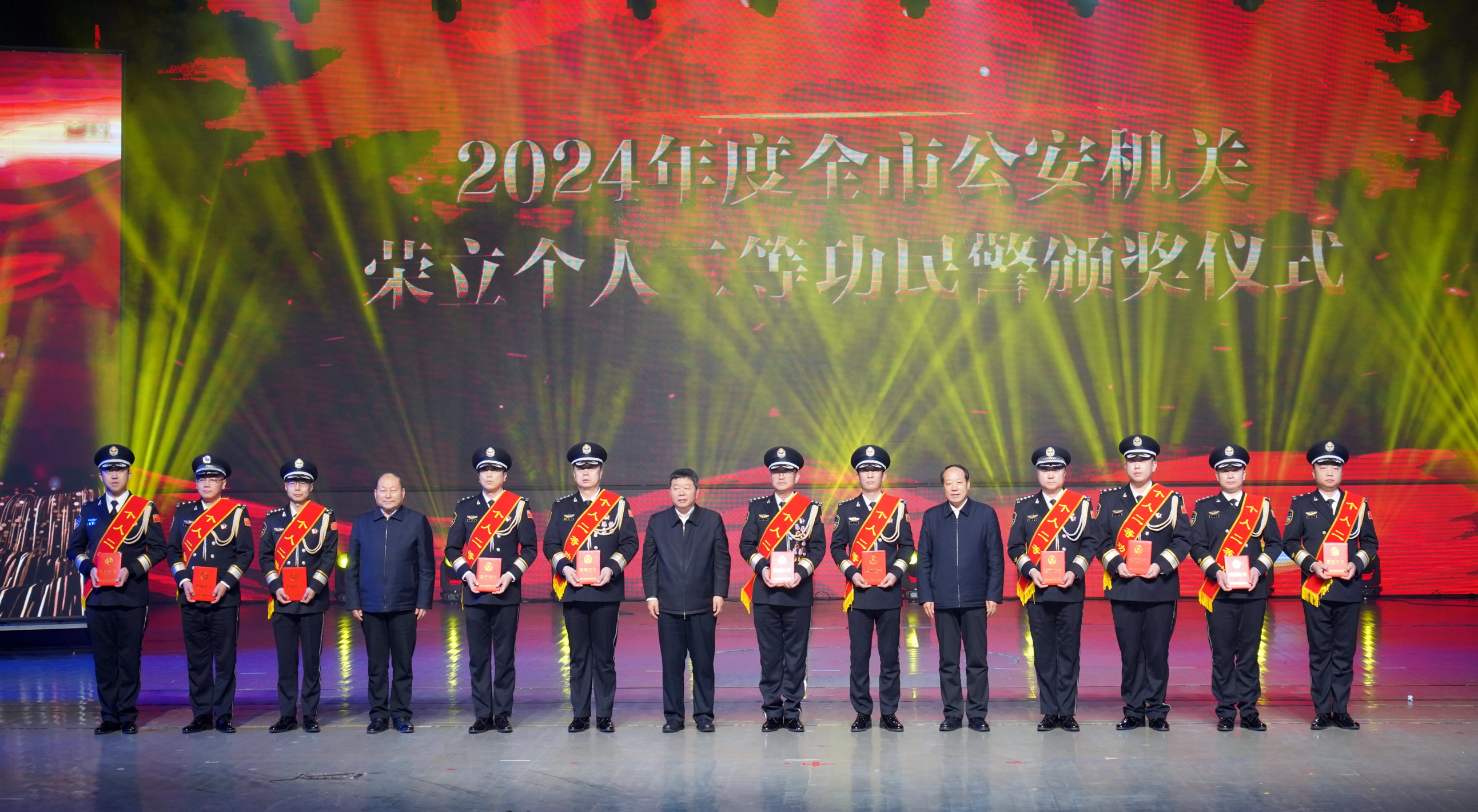 市委副書記、市長(zhǎng)王亞軍,市人大常委會(huì)主任劉文勤,市政協(xié)主席吳清海,為榮立個(gè)人二等功民警頒獎(jiǎng)
