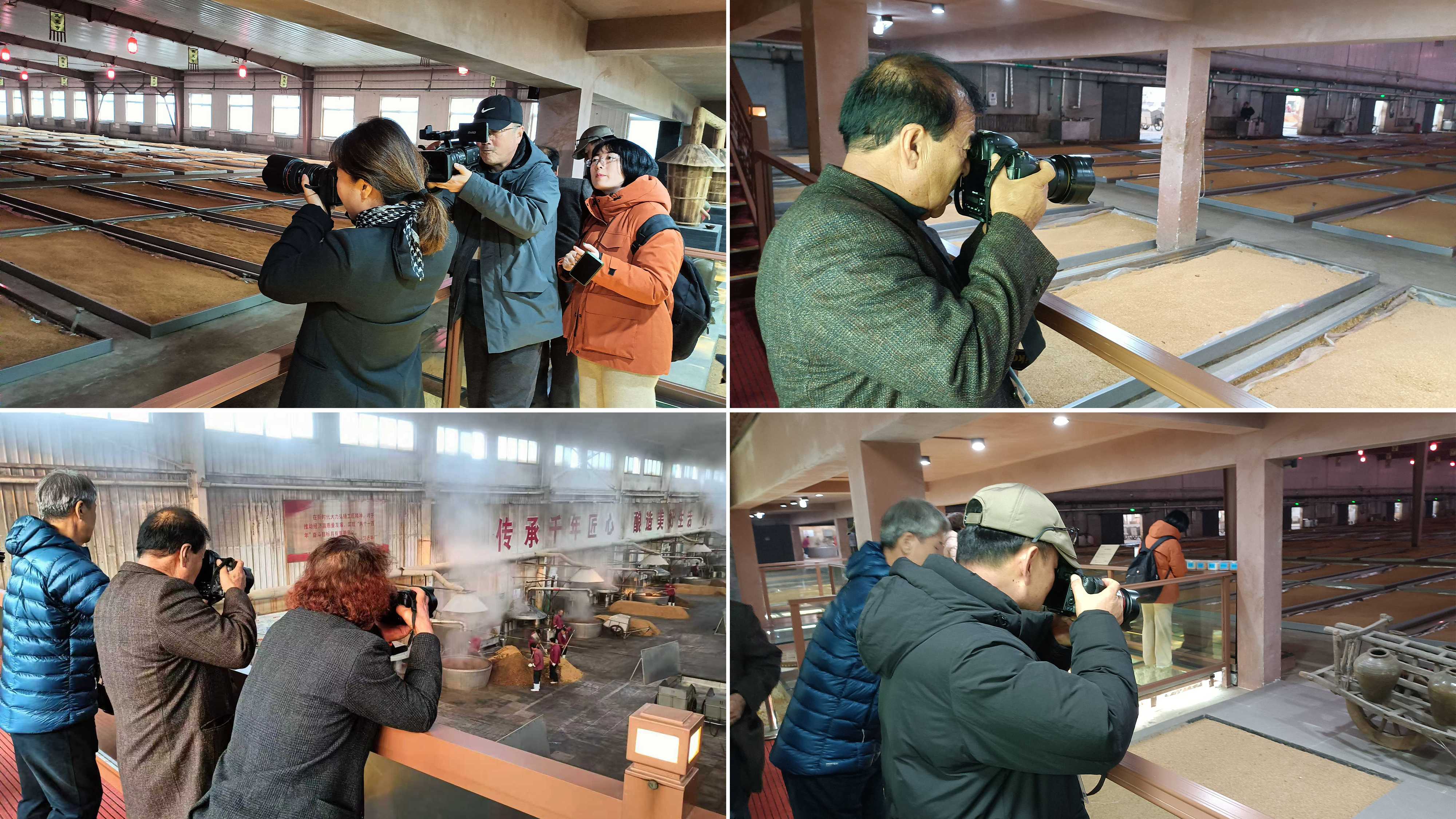 隨后,中韓攝影家們先后參觀了板城燒鍋酒博物館與生產(chǎn)廠區(qū),深入了解了從選糧、發(fā)酵、蒸餾到陳釀的全流程工藝。攝影家們穿梭于古樸的窖池與現(xiàn)代生產(chǎn)線之間,不斷按下快門,記錄下工人勞作的身影、蒸汽氤氳的車間場(chǎng)景,以及充滿歲月痕跡的酒器文物。光影交錯(cuò)間,北方白酒釀造的文化底蘊(yùn)與工業(yè)美學(xué)被一一凝固定格。